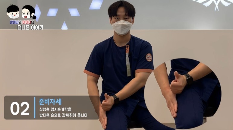 실행측 엄지손가락을 반대측 손으로 감싸 쥐어 줍니다.