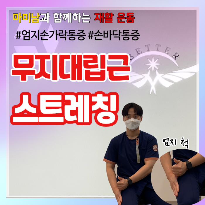 모지구(Hyper thenar)를 형성하는 근육에는 모지대립근과 모지내전근, 단모지외전근, 단모지굴곡근으로 구성되게 됩니다. 이중 모지대립근과 모지내전근의 문제시에는 글씨쓰기, 물건집기, 가위질하기, 주먹쥐기 등이 힘들어 지고 피로도가 빠르게 오게 됩니다. 또한 손바닥 모지구 부분에 통증이 발생될 수 있습니다. 모지대립근 스트레칭은 모지대립근과 모지내전근을 동시에 스트레칭 하기에 유용한 스트레칭입니다.